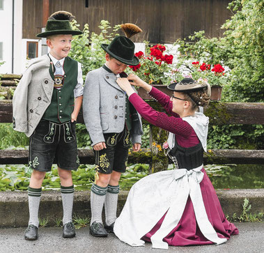 die Männer schneidig in kurzer Hose, Kettlschilee und Miesbacher Joppe mit Scheibling und Gamsbart. Die Frauen, je nach Anlass und Alter, in Mieder, Schalk oder Kirchengewand. .